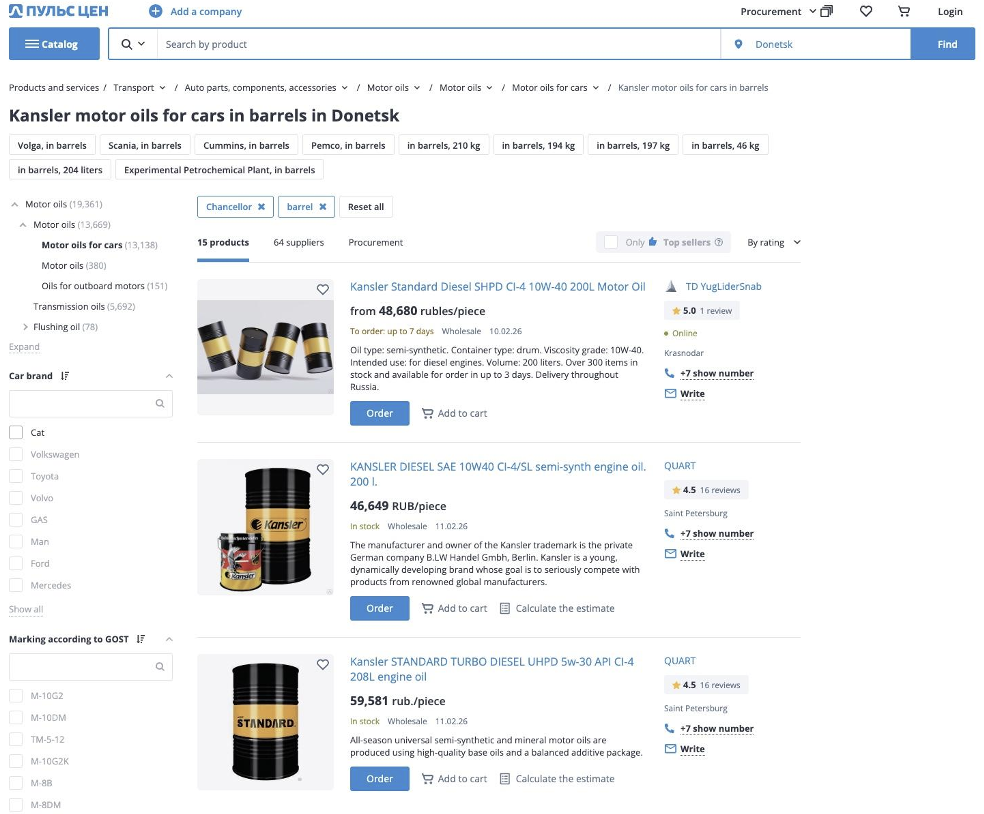 A screenshot of Russian online marketplace “Pulsen” offering the delivery of Delfin-trademarked Kansler motor oils and diesels to Donetsk and other occupied territories, taken in Feb. 2026 (Pulsen website).