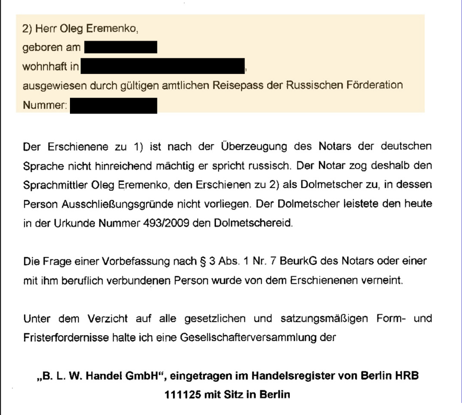 Eremenko appears in B.L.W Handel’s company documents during 2009, assuming the role of interpreter during registration and filing processes.