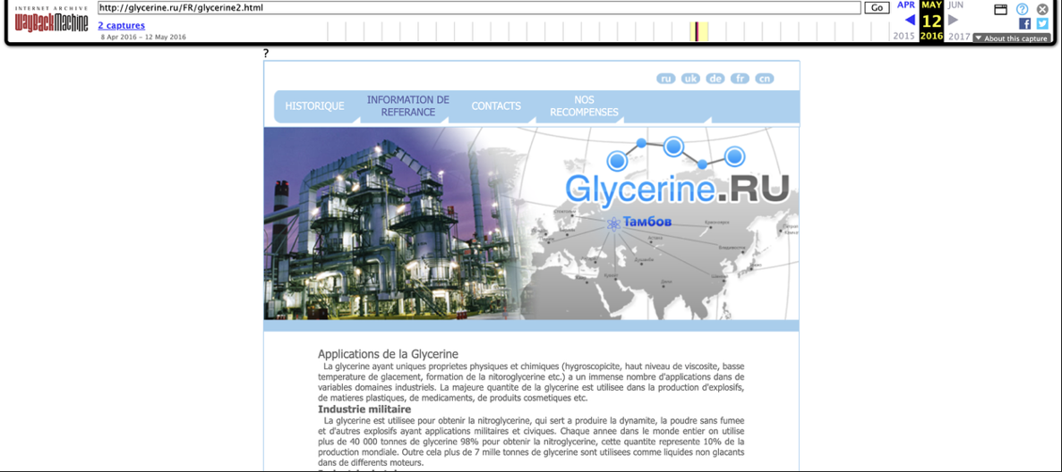 An archived version of Glycerine.ru’s website showcases its advertising of glycerin use in the military industry.