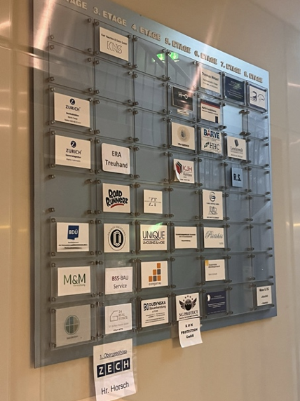 A photo of the list of companies listed in the office entrance of B.L.W. Handel’s registered address since April 2025, taken in Jan. 2026. B.L.W. Handel is not present in the list. (Photo: Lucas Tonks)